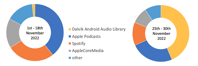 From 1-18th of November, Dalvik downloads on the Sport Social Podcast Network accounted for 2% of the network downloads. From the 25th to the 29th, that rose to 44%.